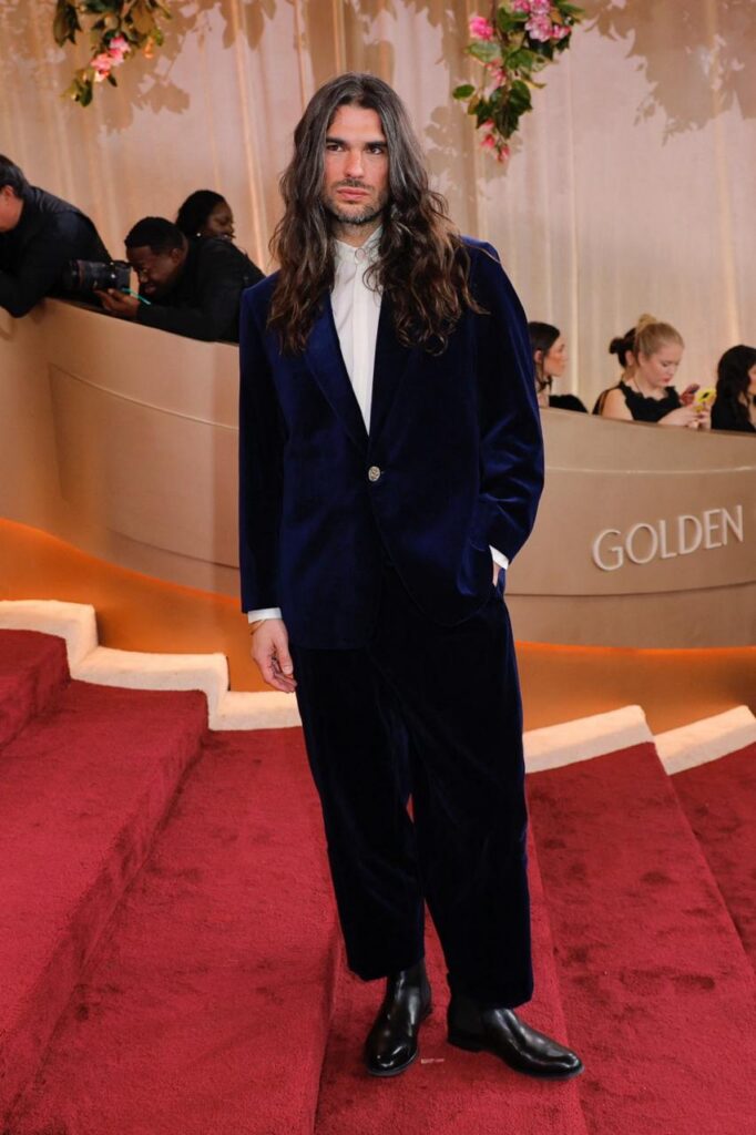 Oliver Laxe llegó a los Globos de Oro 2026, el actor de la película Sirât, que logró dos nominaciones, lució un traje azul y el cabello suelto.