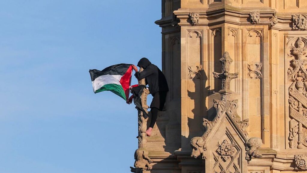 Hombre escala el Big Ben con bandera de Palestina y moviliza a la policía