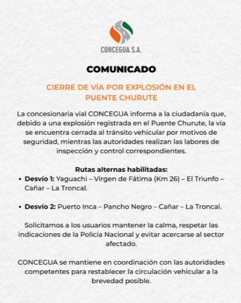 La concesionaria vial CONCEGUA informa que, debido a una explosión en el Puente Churute – Guayas, la vía se encuentra cerrada al tránsito seguridad, mientras las autoridades realizan las labores de inspección