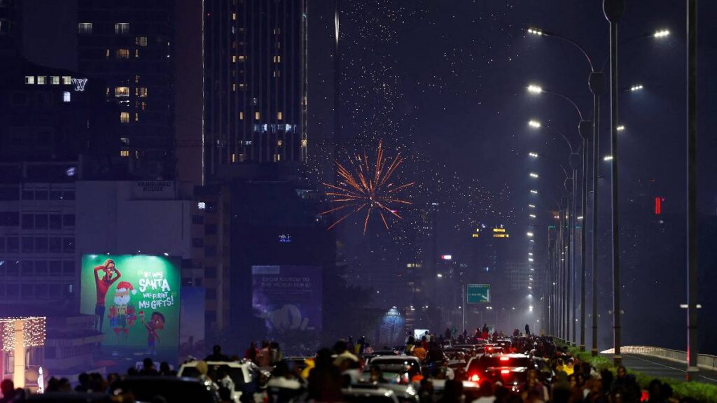 Fuegos artificiales explotan sobre la Torre de Oficinas del Global Trade Center durante las celebraciones de Año Nuevo en Nairobi, Kenia. Los asistentes observan en el tráfico el espectáculo para despedir al 2025.