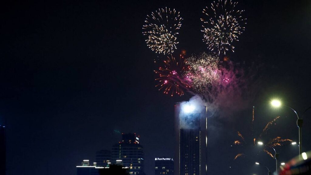 Tailandia también ya entró en el año 2026 con una cuenta regresiva y un espectáculo de fuegos artificiales ecológicos que iluminaron el cielo de Bangkok a lo largo del río Chao Phraya sobre los grandes almacenes Icon Siam.