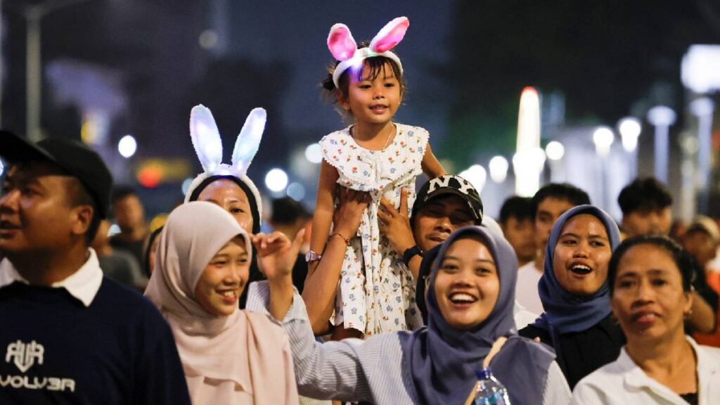Los fuegos artificiales explotan sobre el Monumento Selamat Datang durante las celebraciones de Nochevieja en Yakarta, Indonesia. La gente se reúne en las plazas con lentes o diademas del 2026 para recibir al Año Nuevo.