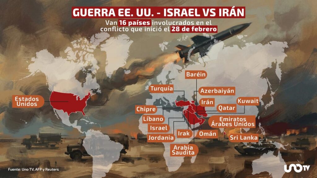 La guerra entre Irán, Estados Unidos e Israel se ha extendido a 16 países tras una serie de ataques con misiles y drones iraníes, así como operaciones militares realizadas por Estados Unidos e Israel. El conflicto, que comenzó el sábado con bombardeos contra territorio iraní, se ha ampliado hacia varios países de Medio Oriente y Europa, de acuerdo con reportes oficiales y declaraciones de autoridades.