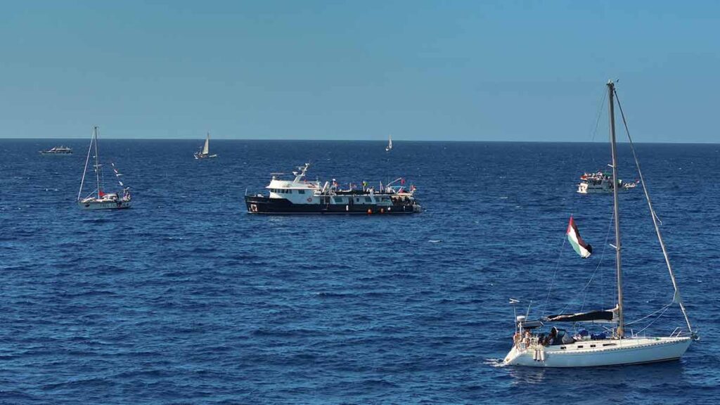 “30 barcos siguen navegando con fuerza hacia Gaza, a solo 46 millas náuticas (85 kilómetros) de distancia, a pesar de las incesantes agresiones de la marina de ocupación israelí”,