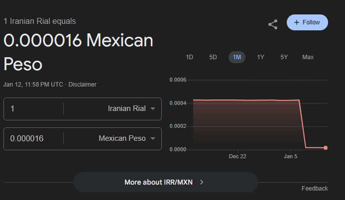 Al inicio de las protestas, el rial se cotizaba en casi 2 mil 325 riales por peso mexicano, mientras que un dólar equivalía a más de 41 mil 666 riales, ya entonces un valor residual.