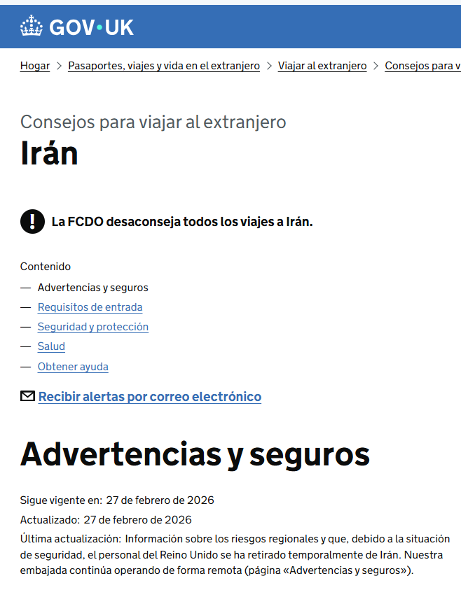 El Gobierno británico se sumó a las advertencias internacionales y desaconsejó cualquier viaje a Irán, en medio del aumento de la tensión regional y el riesgo de una escalada que pueda afectar la seguridad y las comunicaciones.