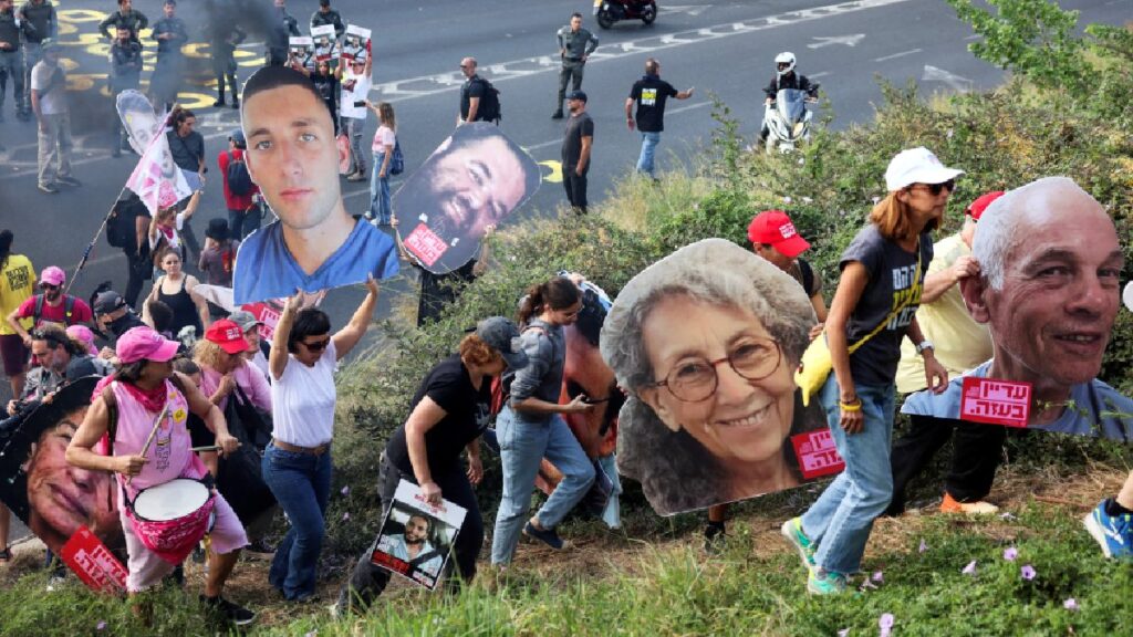Muchos participantes portaban camisetas con mensajes dirigidos al expresidente Donald Trump, como “Sr. Trump, hágalo realidad”, y pancartas en hebreo e inglés. Los textos expresaban demandas como “Detén tus guerras” y “Traigan a todos a casa”.
