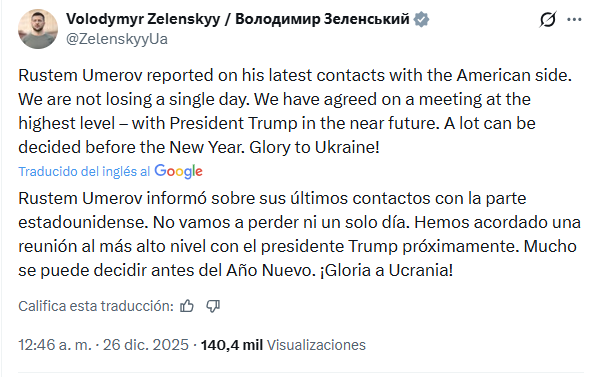 “No malgastamos ni un solo día. Hemos acordado una reunión al más alto nivel, con el presidente Trump, en un futuro cercano”, escribió el mandatario ucraniano. Añadió que “se puede decidir mucho antes del Año Nuevo”, sin ofrecer mayores detalles sobre el formato del encuentro.