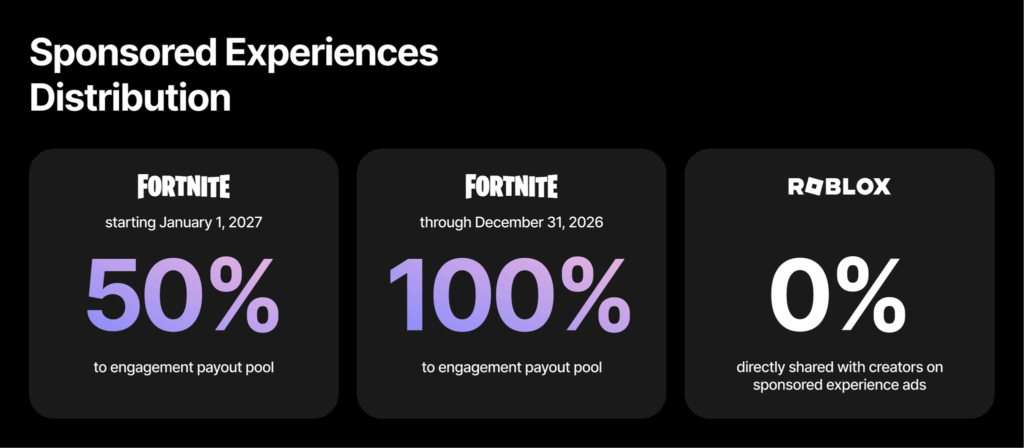 En noviembre, Epic añadirá una sección patrocinada en Descubrir, donde los creadores podrán invertir dinero para ganar mayor visibilidad en sus islas. Podrán participar en una subasta transparente para destacar sus experiencias, y 50 % de los ingresos por patrocinio se destinará al fondo de pagos por interacción, aumentando así el beneficio para todos los creadores.