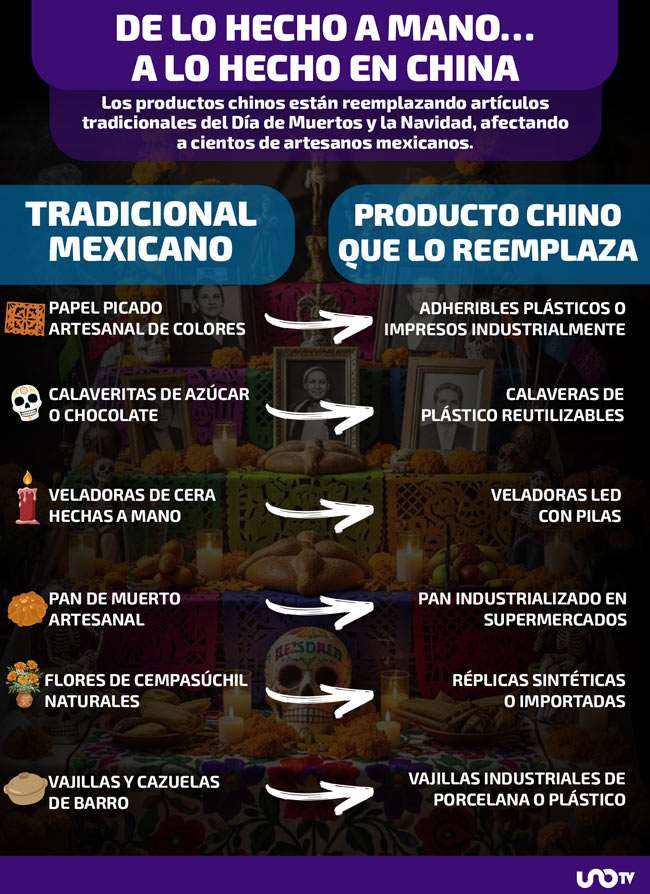 Cada altar u ofrenda es distinto, pero suele incluir elementos como papel picado, veladoras, calaveritas de azúcar y vajillas de barro, productos elaborados por artesanos locales. Sin embargo, estos artículos han sido reemplazados por versiones importadas desde China, fabricadas con materiales sintéticos o industriales y ofrecidas a precios más bajos.