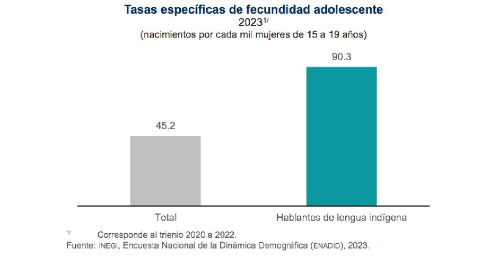 Según la Encuesta Nacional de la Dinámica Demográfica (ENADID) 2023, la tasa de fecundidad en adolescentes fue de 45.2 nacimientos por cada mil mujeres de 15 a 19 años, pero entre las hablantes de lengua indígena la cifra se duplica: 90.3 nacimientos por cada mil.
