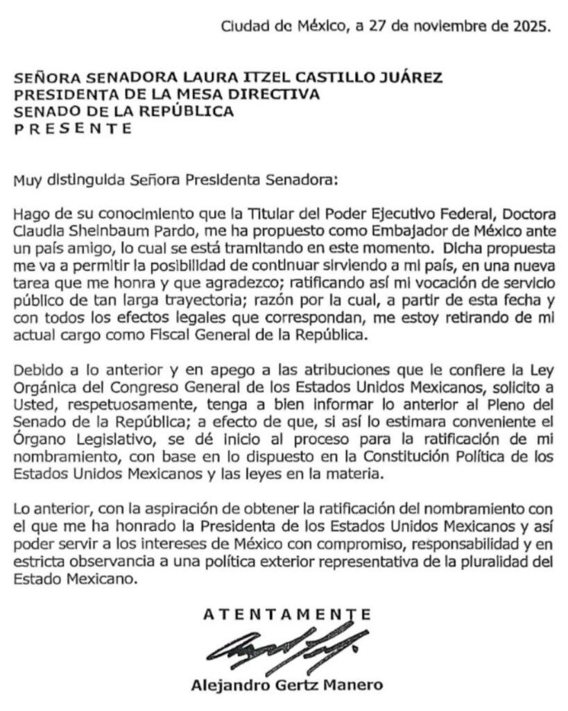 La renuncia de Alejandro Gertz Manero a la Fiscalía General de la República (FGR) quedó formalizada este jueves mediante una carta enviada a la presidenta del Senado, Laura Itzel Castillo Juárez. En el documento, fechado el 27 de noviembre de 2025, el fiscal notificó que la presidenta Claudia Sheinbaum lo propuso como embajador de México, lo que lo llevó a separarse del cargo.