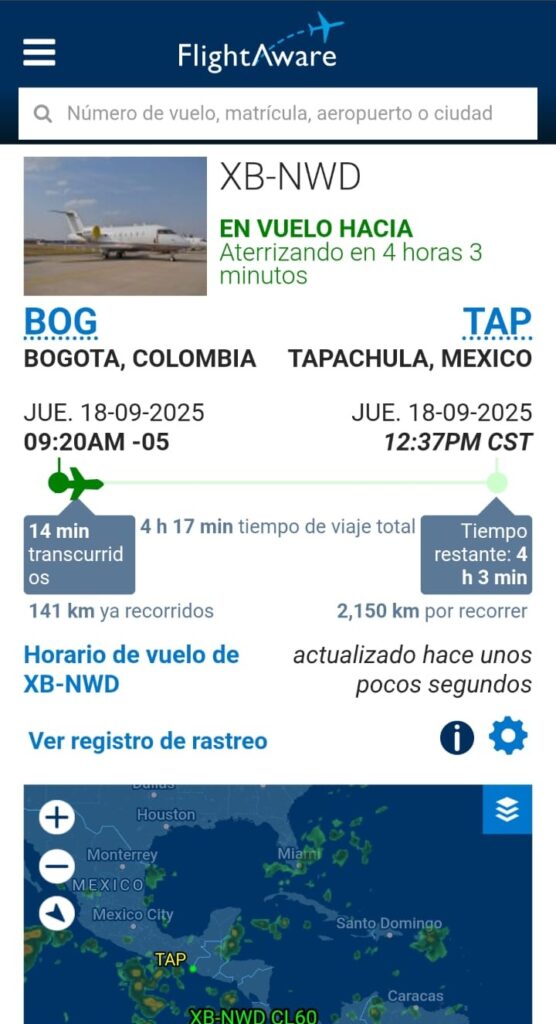 Se espera que el avión llegue al Aeropuerto Internacional de Tapachula, Chiapas, alrededor de las 8:30 de la mañana, para continuar posteriormente hacia el Aeropuerto Internacional de Toluca, en el Estado de México.