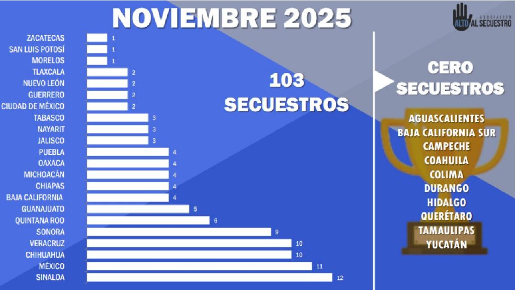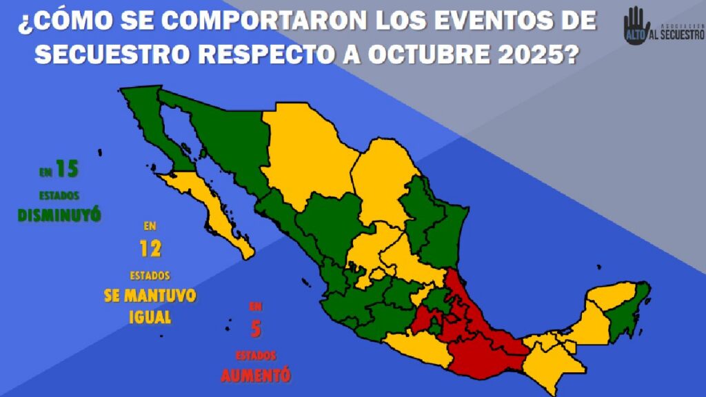 A partir de un análisis, la Asociación Alto al Secuestro determinó que los secuestros aumentaron en cinco estados en noviembre de 2025, comparando con el mes anterior.