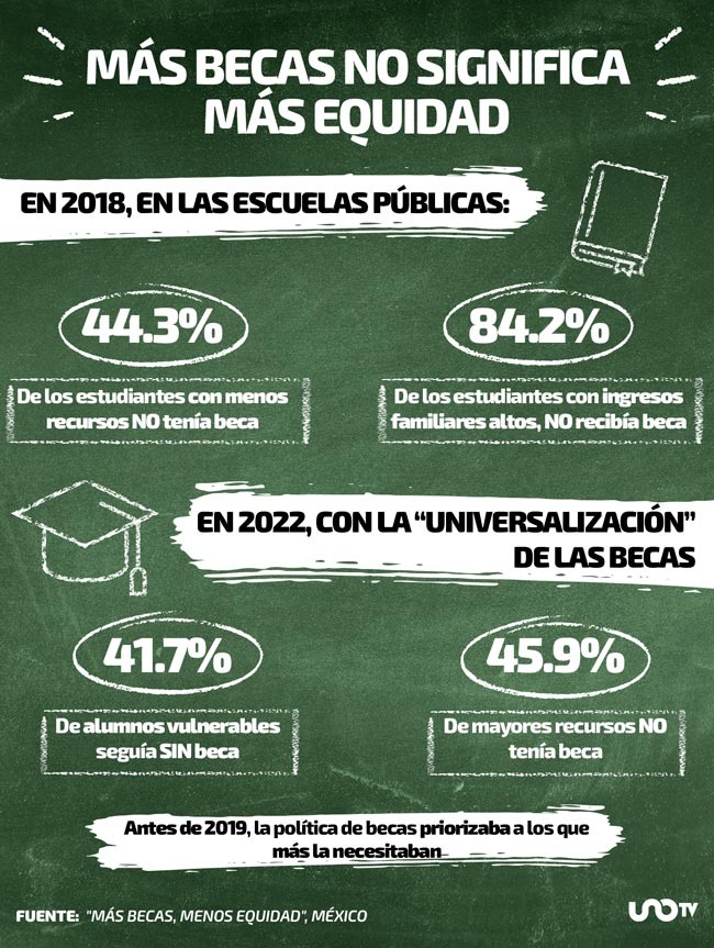 El estudio de México Evalúa confirma un giro preocupante, pues antes de 2018 se focalizaba a los estudiantes que más necesitaran el apoyo, mientras que a partir de la “universalización” se presentó mayor apoyo proporcional hacia los alumnos cuyos padres tenían más ingresos.