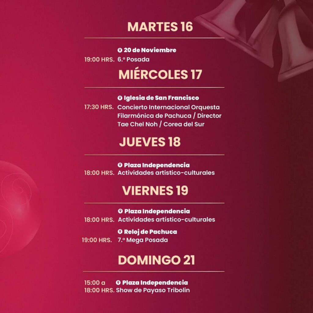 El gobierno de Pachuca, Hidalgo, informó que el viernes 19 de diciembre se organizará una Mega Posada frente al Reloj de Pachuca. Las actividades de este evento navideño comenzarán a las 19:00 horas.