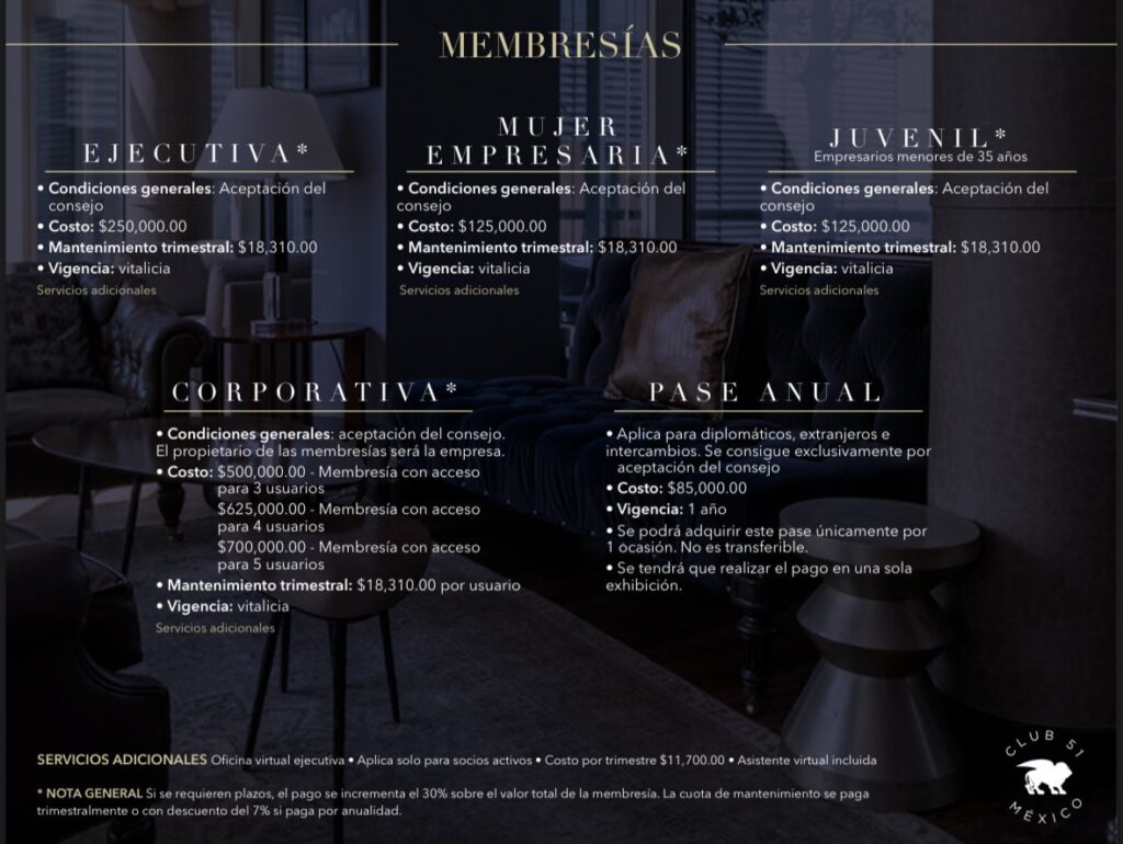 La membresía es transferible, por lo que puede traspasarse, lo que la convierte en un activo de inversión para quienes forman parte del club. Por otra parte, hay una opción con costo de 85 mil pesos, más mantenimiento trimestral y con vigencia de un año que se puede adquirir únicamente una vez, esta alternativa, según explican, no es transferible.