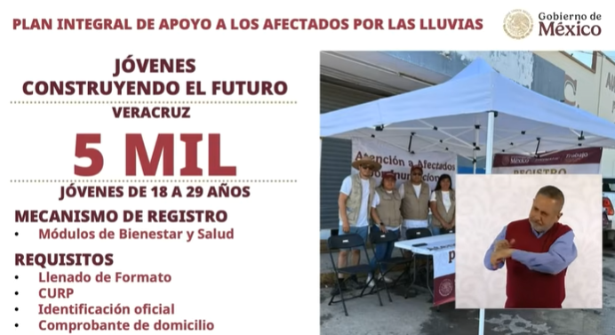 Además de este programa, la funcionaria indicó que cinco mil jóvenes de 18 a 29 años de edad podrán registrarse a Jóvenes Construyendo el Futuro en Poza Rica y Álamo, los municipios más afectados de Veracruz, para labores de limpieza.