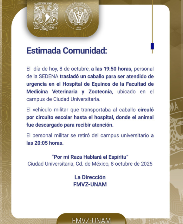 El 8 de octubre de 2025, personal de la Secretaría de la Defensa Nacional (Sedena) ingresó a Ciudad Universitaria para trasladar a un caballo al Hospital de Equinos de la Facultad de Medicina Veterinaria y Zootecnia de la UNAM, donde recibiría atención urgente. La FMVyZ reportó que los militares se retiraron del campus a las 20:05 horas.
