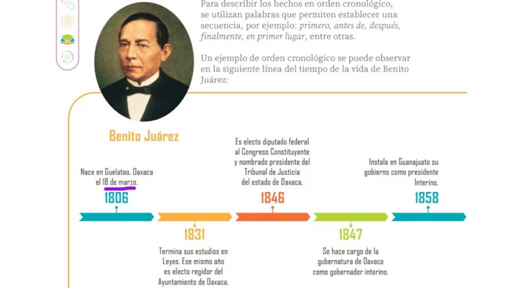 En el libro Nuestros Saberes de tercer grado de primaria se observa en la página 18 una cronología de Benito Juárez, expresidente de México.