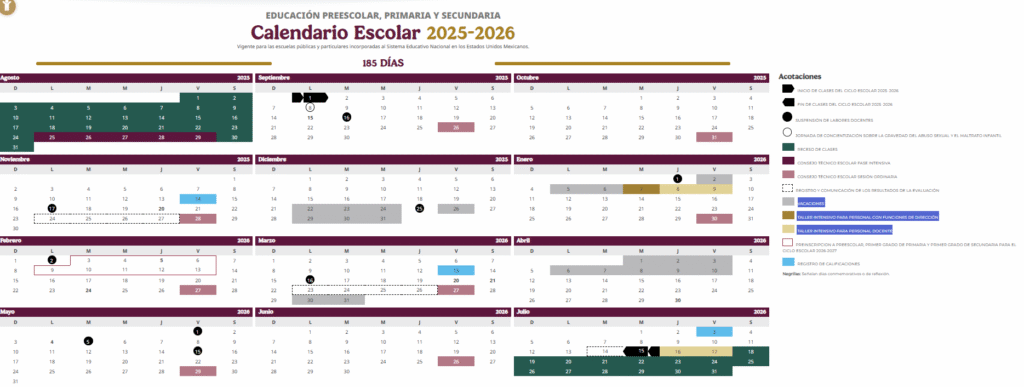 El calendario escolar también incluye dos semanas de receso por Semana Santa, programadas del 30 de marzo al 10 de abril de 2026. El ciclo escolar 2025-2026 finalizará el miércoles 15 de julio de 2026.