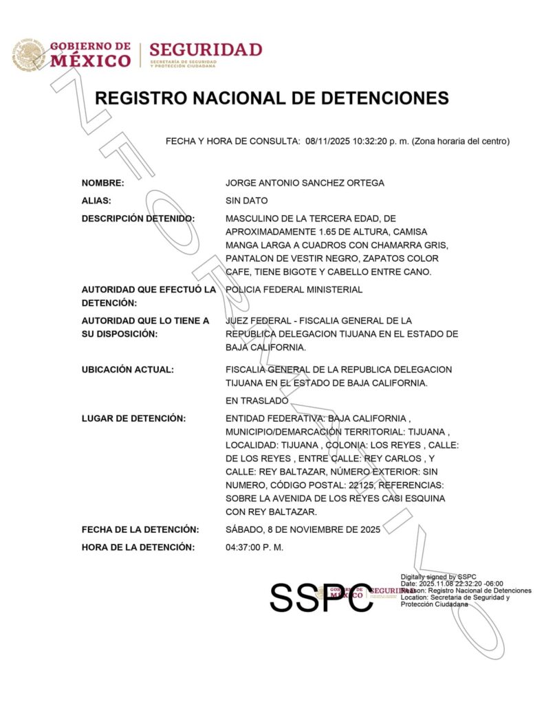 De acuerdo con el Registro Nacional de Detenciones (RND) de la Secretaría de Seguridad y Protección Ciudadana (SSPC), Jorge Antonio fue aprehendido este sábado a las 16:37 horas en la colonia Los Reyes de Tijuana, Baja California por elementos de la Policía Federal Ministerial.