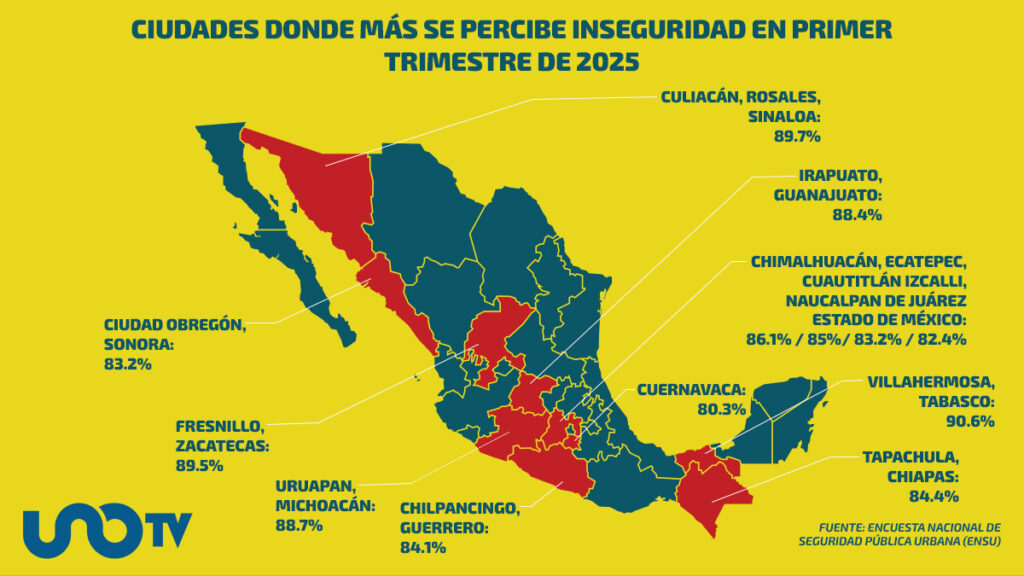 Para darnos una idea, comparamos las cifras del primer trimestre de 2025, según los datos de la ENSUE, con las de diciembre de 2024, donde se anota el caso de ciudades como Villahermosa (Tabasco), Uruapan (Michoacán), Culiacán (Sinaloa) y Fresnillo (Zacatecas), donde más del 90% de la población considera que vivir en su ciudad es inseguro. Estas cifras reflejan focos rojos en términos de percepción ciudadana; sin embargo, en los datos del primer trimestre de 2025 de la ENSU, hubo variaciones, acá te las mostramos.