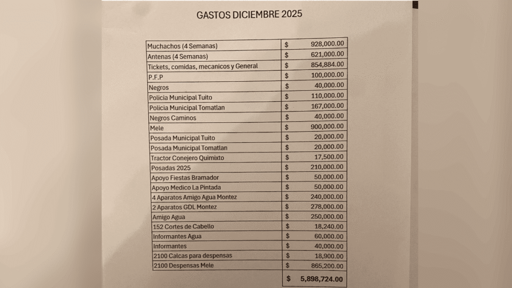 Además, aparecen presuntos sobornos a policías municipales en municipios como Sayula, Tapalpa, Atemajac y Chiquilistlán, con montos que van de 74 mil a 236 mil pesos.