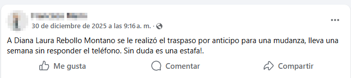 María —nombre ficticio para proteger su identidad— también fue víctima de un fraude en servicios de mudanza. El 4 de enero de este 2026 publicó un mensaje en el grupo de Facebook “Fletes y mudanzas económicos” donde contó su experiencia.