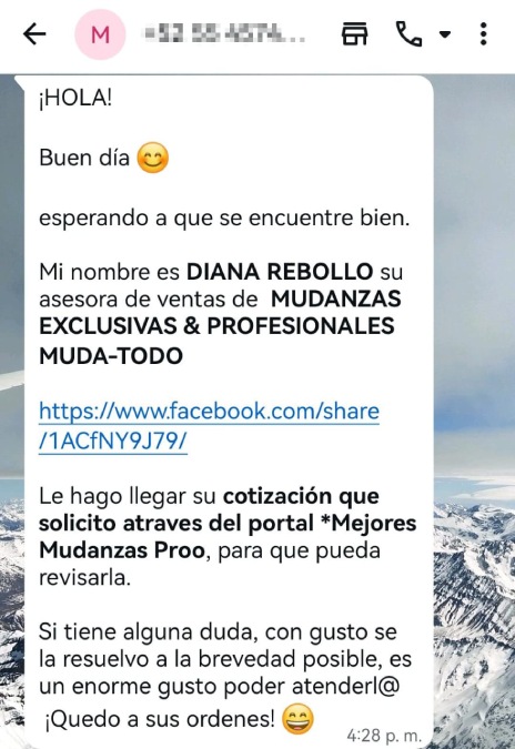 Tras ingresar sus datos, “Francisco” fue contactado por “Muebles y Mudanzas Diana”, presuntamente a cargo de Diana Laura Rebollo Montaño. Ella también se anuncia en plataformas como Facebook e Instagram.