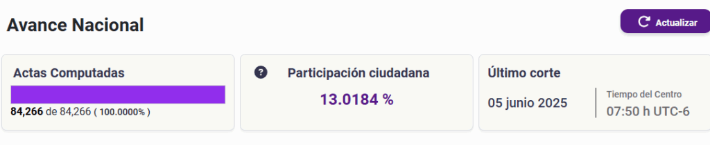 El último reporte del Instituto Nacional Electoral (INE), con corte a las 07:30 horas del jueves 5 de junio y con el 100% de actas computadas, indica quiénes serán los nueve ministros, cinco mujeres y cuatro hombres, que integren el máximo tribunal de justicia del país.