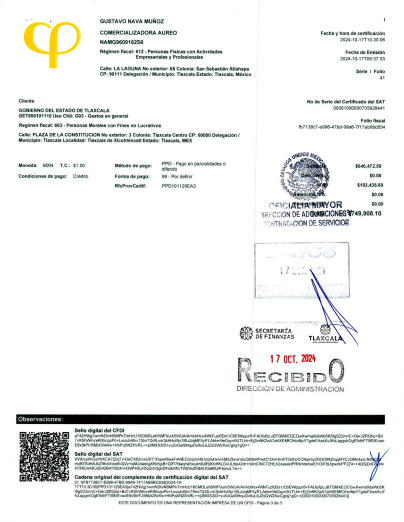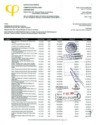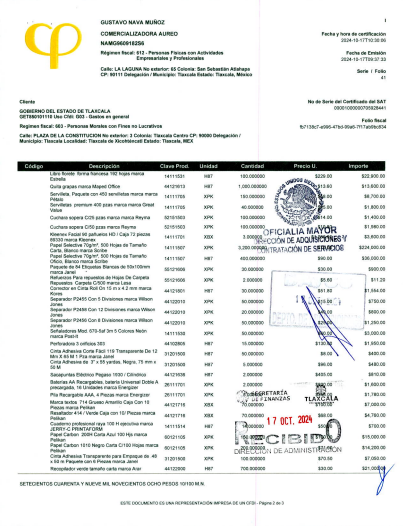 Una factura emitida en octubre de 2024 al Gobierno de Tlaxcala reportó ventas de materiales de oficina por 749 mil 908 pesos.