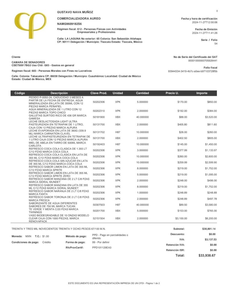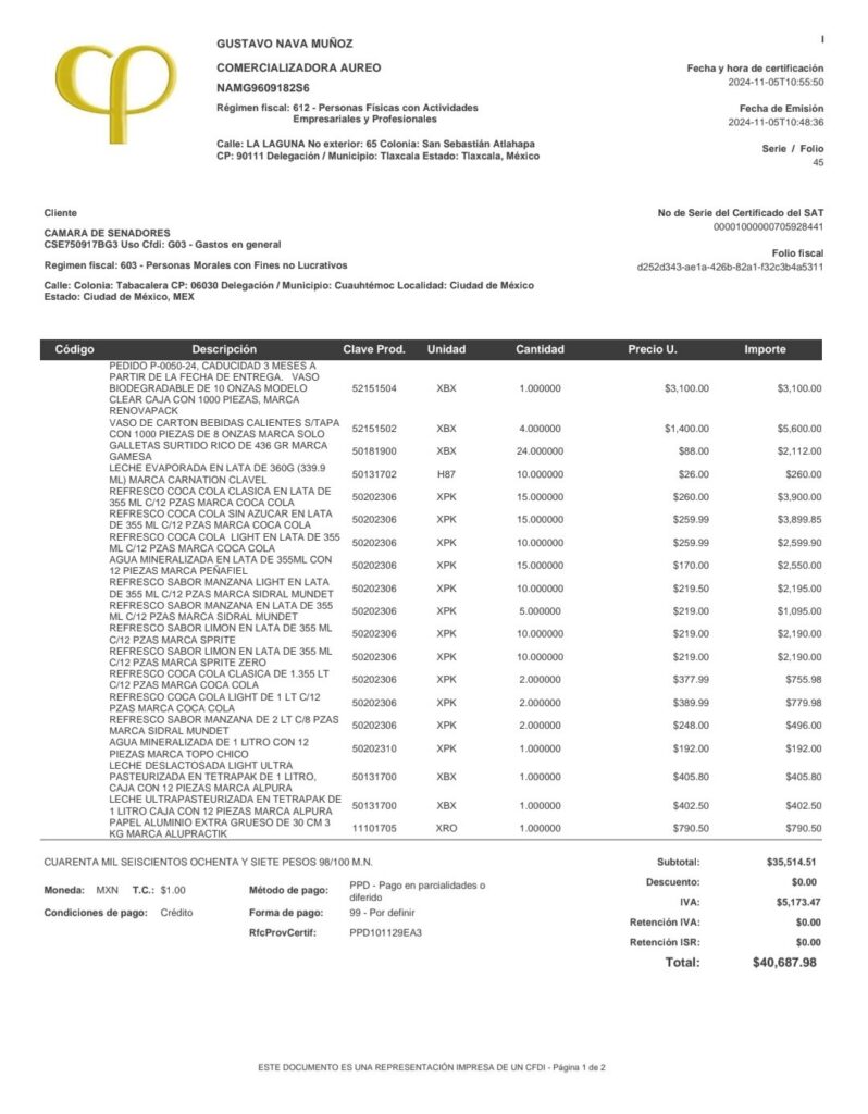 Senado también gastó alrededor de 200 mil pesos en alimentos