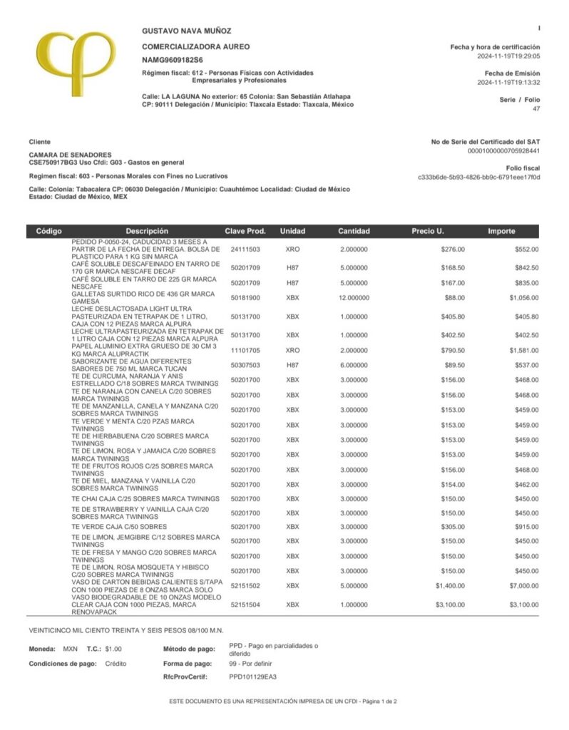 Los artículos de belleza y los servicios de alimentos fueron suministrados por la empresa Comercializadora Aureo, propiedad de Gustavo Nava Muñoz, identificado como cercano a Adán Augusto López Hernández.
