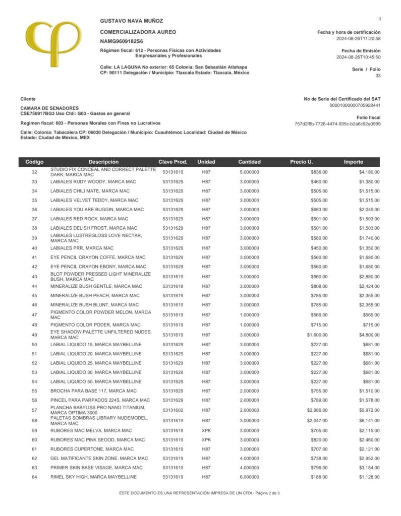 Facturas dadas a conocer por Libro Negro revelan que durante 2024, el Senado de la República destinó 194 mil pesos para la adquisición de productos cosméticos y herramientas para el cuidado personal.