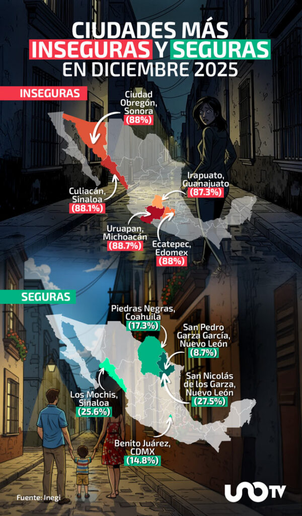 De forma específica, solo en seis ciudades de México bajó la percepción de inseguridad en diciembre del 2025. En cambio, incrementó en 23 ciudades.