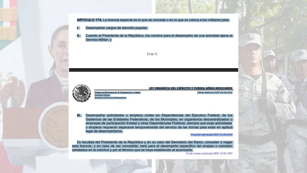 El artículo 174 de la Ley Orgánica del Ejército y Fuerza Aérea Mexicanos ya contempla la figura de licencias para el personal en activo. En ese marco, los militares pueden separarse temporalmente del servicio, sin perder su estatus institucional, para participar en procesos electorales u otros fines personales o profesionales.