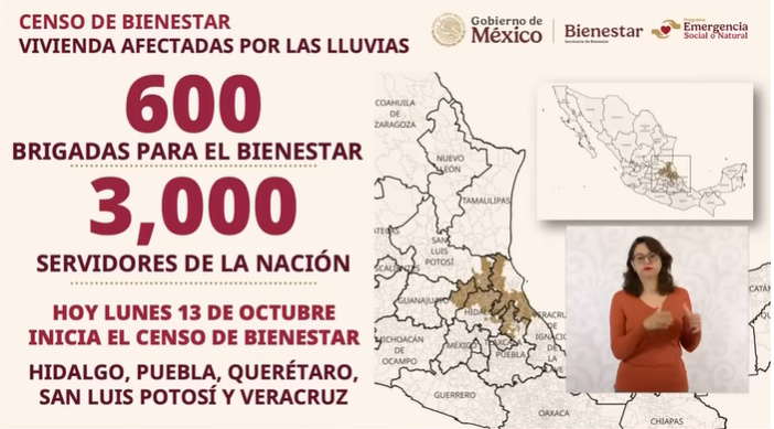 La secretaria del Bienestar, Ariadna Montiel, indicó en la conferencia mañanera que, a través del Programa para el Bienestar de las Personas en Emergencia Social o Natural (PESN), 600 brigadas con 3 mil servidores de la nación realizarán el Censo de Bienestar casa por casa para apoyar a las familias de las zonas afectadas por las intensas lluvias.