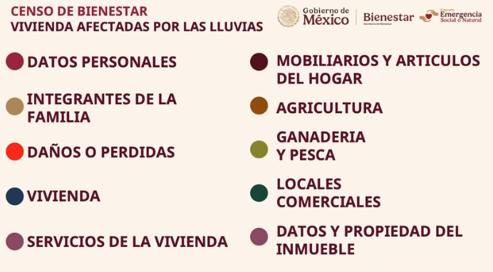La funcionaria detalló cómo se realizará el censo para que las familias afectadas puedan recibir los apoyos del gobierno federal. Precisó que los servidores de la nación recopilarán el censo se realizará a través de un formato que será llenado por los servidores de la nación en el que las personas afectadas registrarán la siguiente información: