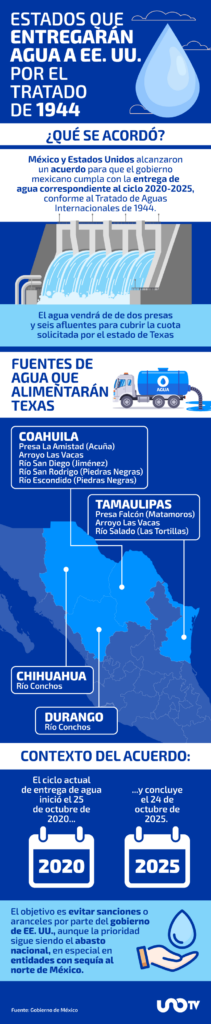 El Gobierno de México acordó con Estados Unidos la entrega de agua a EE. UU. como parte del cumplimiento del Tratado de 1944, el cual regula el reparto del recurso del Río Bravo. Esta medida se concretó luego de semanas de presión por parte del presidente Donald Trump, quien amenazó con sanciones si no se cumplía el tratado. La distribución se realizará a través de presas y afluentes ubicados en varios estados del norte del país.