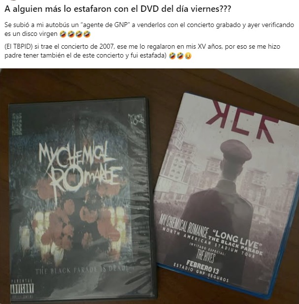 Una persona denunció en redes sociales que fue víctima de una estafa con un DVD tras el concierto de My Chemical Romance del viernes 13 de febrero.