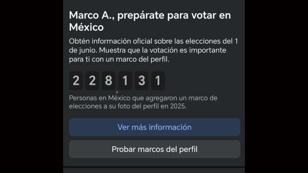 El mensaje inicia con el nombre del usuario “Marco A., prepárate para votar en México. Obtén información oficial sobre las elecciones del 1 de junio. Muestra que la votación es importante para ti con un marco del perfil”.