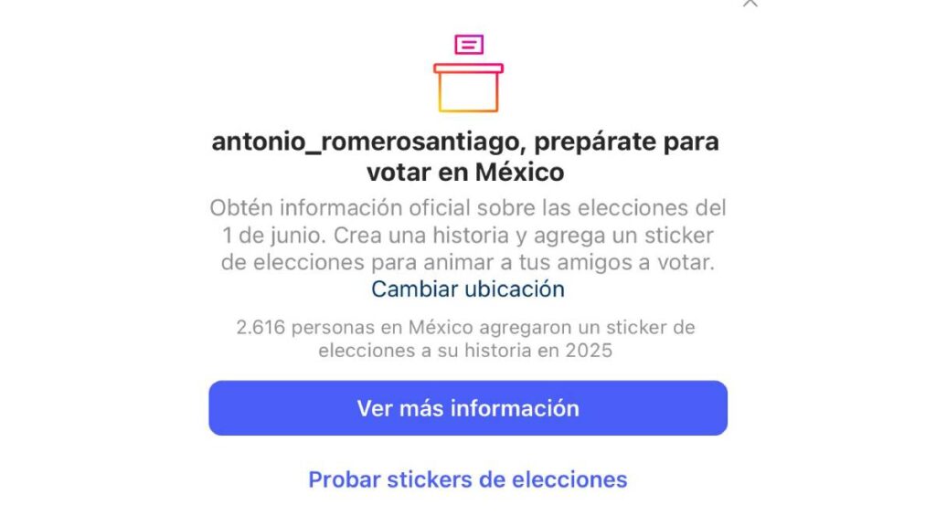 Aquí también se inicia todo con el nombre de usuario “antonio_romerosantiago, prepárate para votar en México. Obtén información oficial sobre las elecciones del 1 de junio. Crea una historia y agrega un sticker de elecciones para animar a tus amigos a votar”.