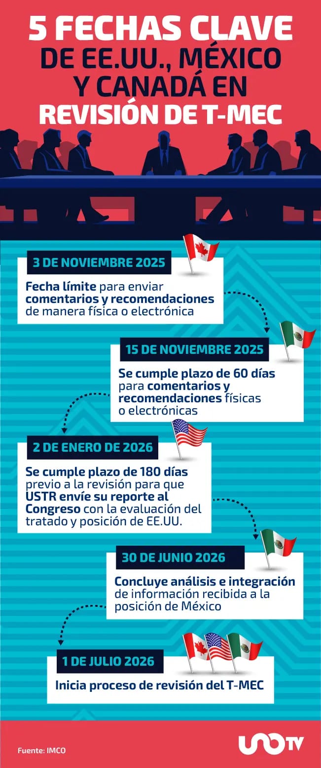 De acuerdo con un análisis del Instituto Mexicano para la Competitividad (IMCO), Rumbo a la revisión del T-MEC: proceso de consultas, los tres socios avanzan en procesos de consulta pública, donde ciudadanos, empresas, cámaras y especialistas podrán plantear mejoras y preocupaciones sobre el funcionamiento del Tratado.