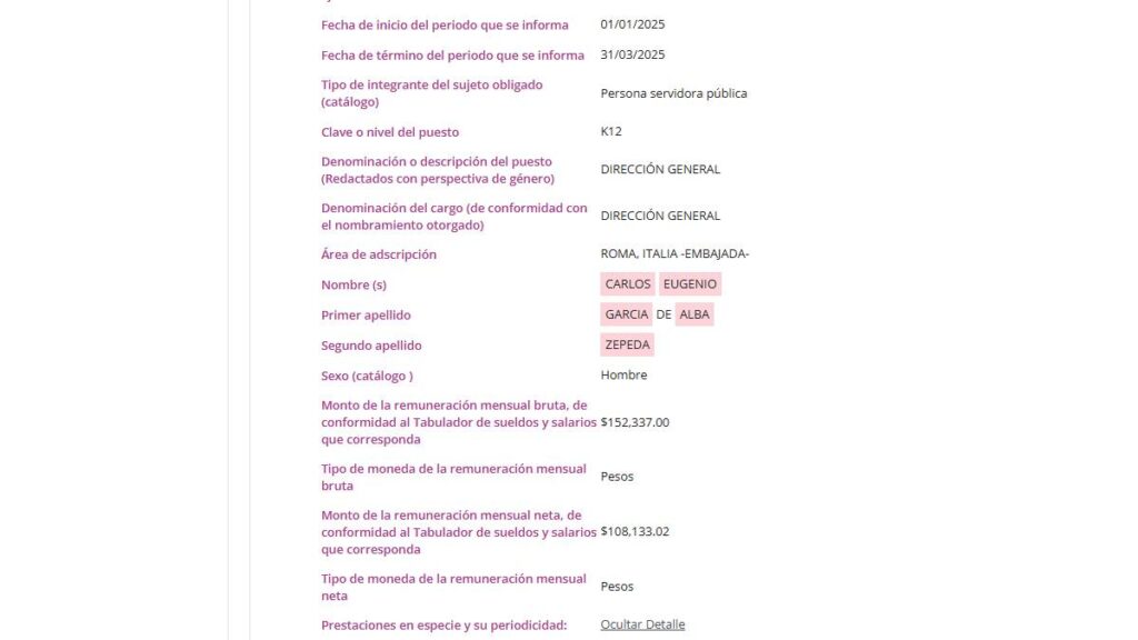 Lozano Valencia sustituirá a Carlos Eugenio García de Alba Zepeda, quien es licenciado en Economía, maestro en Ciencias Diplomáticas y doctor en Sociología. Él ocupaba el cargo desde 2019 con un sueldo mensual bruto de 152 mil 337 pesos, cantidad que probablemente recibirá ahora Genaro.