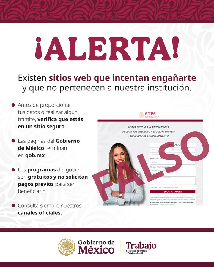 El Gobierno de México emitió una alerta por la detección de un sitio web que suplanta la imagen de la Secretaría del Trabajo y Previsión Social (STPS) para ofrecer supuestos programas de financiamiento. La página https://fondonacional.org.mx es falsa y ajena a la institución.