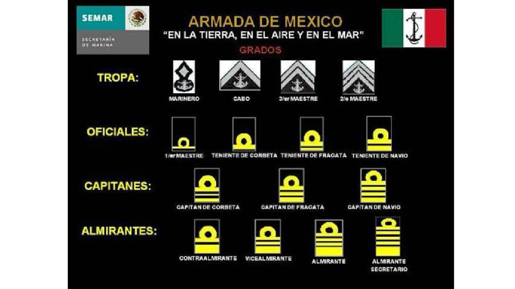 En la Secretaría de Marina los rangos se dividen en tropa, oficiales, capitanes y almirantes.