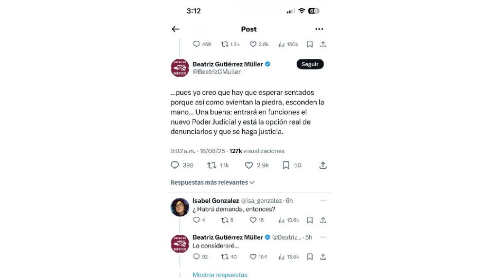 A este mensaje, Gutiérrez Müller respondió: “… Pues yo creo que hay que esperar sentados porque así como avientan la piedra, esconden la mano… Una buena: entrará en funciones el nuevo Poder Judicial y está la opción real de denunciarlos y que se haga justicia”.