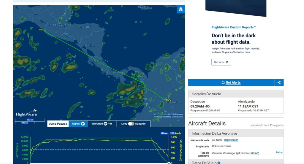 El avión de la Fiscalía General de la República con la matrícula 605 XB-NWD propiedad del Gobierno Mexicano despegó de Bogotá, Colombia, alrededor de las 9:00 de la mañana.