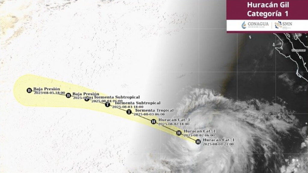 La noche del viernes 1 de agosto, el ciclón tropical Gil 2025 se intensificó a huracán categoría 1 en la escala Saffir-Simpson, informó el Servicio Meteorológico Nacional (SMN). El sistema se ubica a 1,740 kilómetros al oeste-suroeste de Cabo San Lucas, Baja California Sur, en el océano Pacífico, y no genera efectos en territorio mexicano.